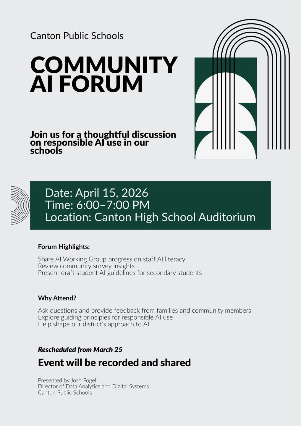 Director of data analytics Josh Fogel and the District’s AI work group is holding a forum to update the public on the drafts of student AI use.